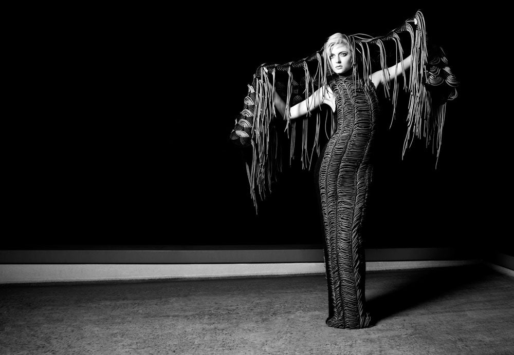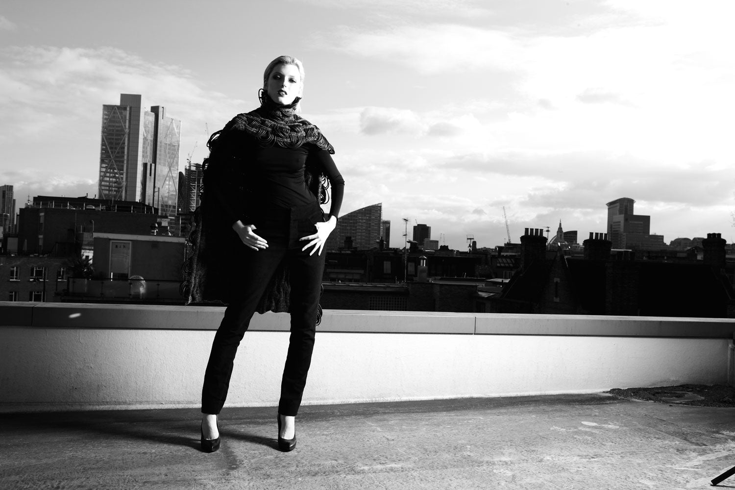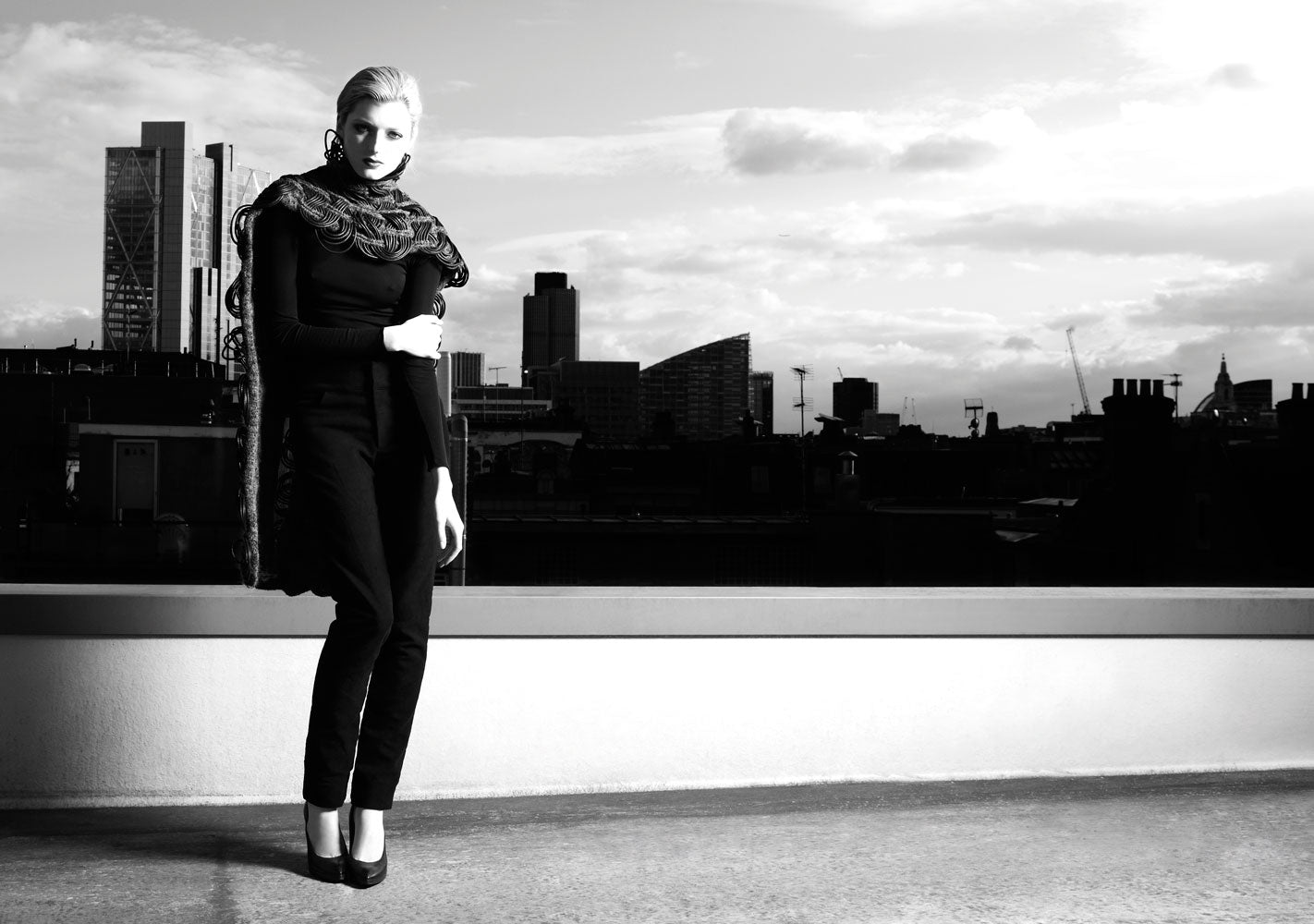 Softly feminine cashmere, mohair and moleskin were layered with waxed cotton cord in a palette of moody blues, greys with a splash of bold colour to create a collection of versatile separates and stand out pieces that offered an edgy, innovative take on bespoke knitwear for the modern woman.