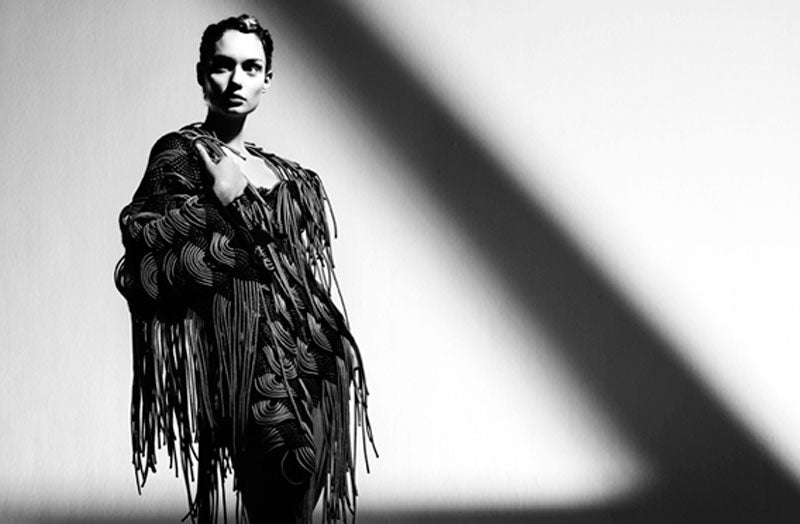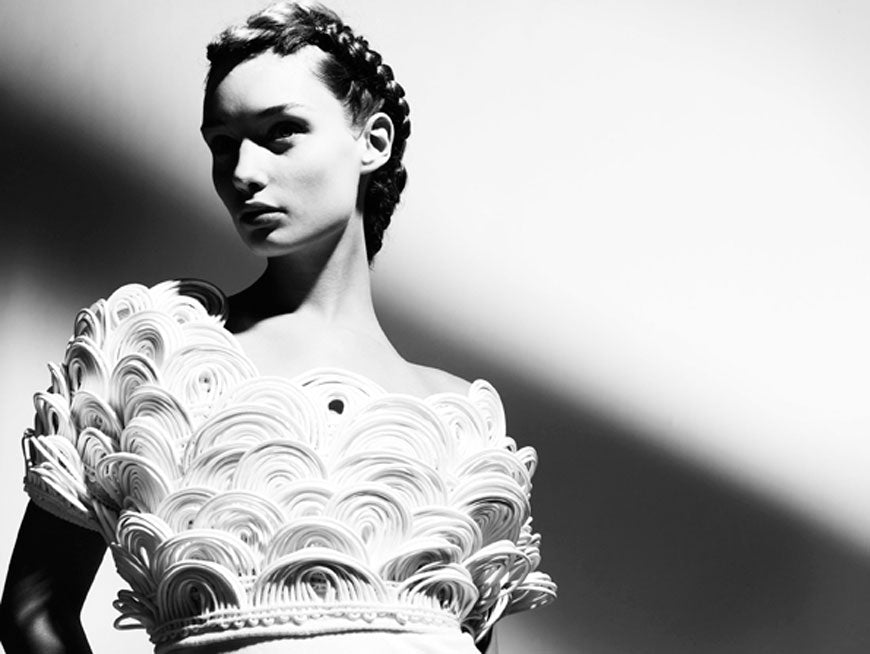 Lightening the feel of his dramatic MA Graduate collection, Derek Lawlor’s debut Spring Summer 2010 collection continued with the same graphic appeal combined with second skin flexibility. The wax cord embellished dresses that had first gained him attention were still present but this time with some more wearable separates included making his collection more versatile.